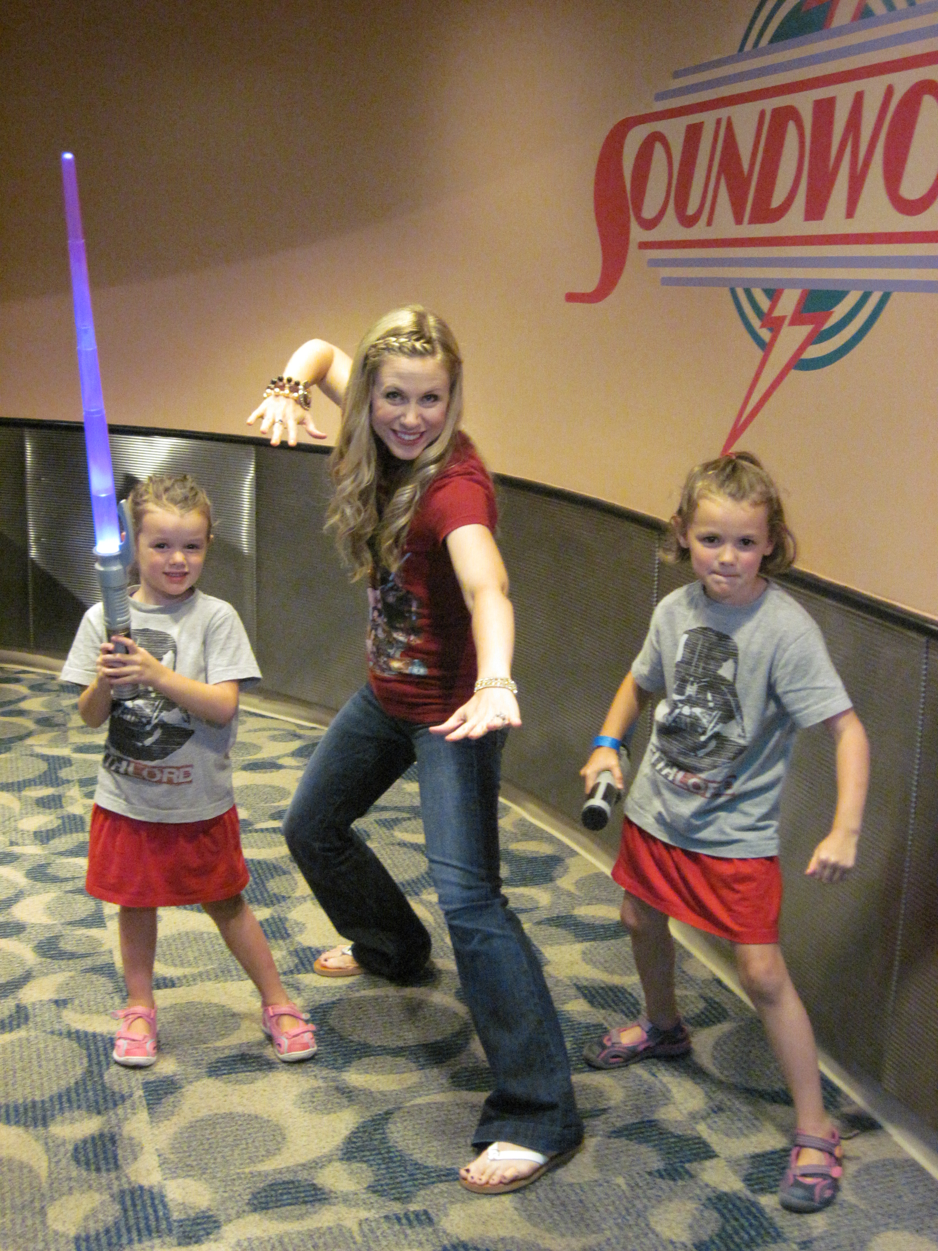 I will tell you that it wasn’t all bad. We had a great time. When we arrived at 8:15 am for a 9:00 opening, we found the park already open. There were still fastpasses for celebrity autographs. We had a choice of Ray Park (Darth Maul) or Ashley Eckstein (voice of Ahsoka Tano), we chose Ashley because my husband the girls love Ahsoka (and my husband wanted to meet her, check out the picture and you will see why). She even signed their custom-made light sabers, which you can make at Star Tours. There was still room in the Jedi Training Academy, so my daughter was able to become a Padawan at Star Wars Weekend! Yes, I know…huge nerd…