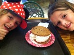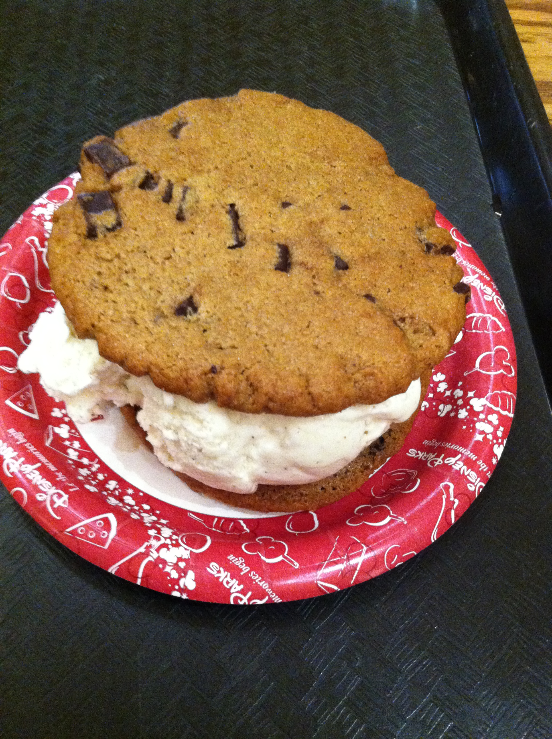 I have finally experienced the famous Ice Cream Sandwich at the Main Street Bakery. The cost was $4.19, but it is still considered a snack credit. We had a choice of cookie: chocolate chip, sugar or oatmeal raisin. I went with the traditional chocolate chip. They put 3 scoops of vanilla ice cream on one giant cookie and then topped the ice cream with another. It was so huge that we cut it